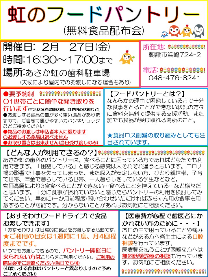 2026年2月27日(金)16時30分~17時、第39回「虹のフードパントリー」を開催します。